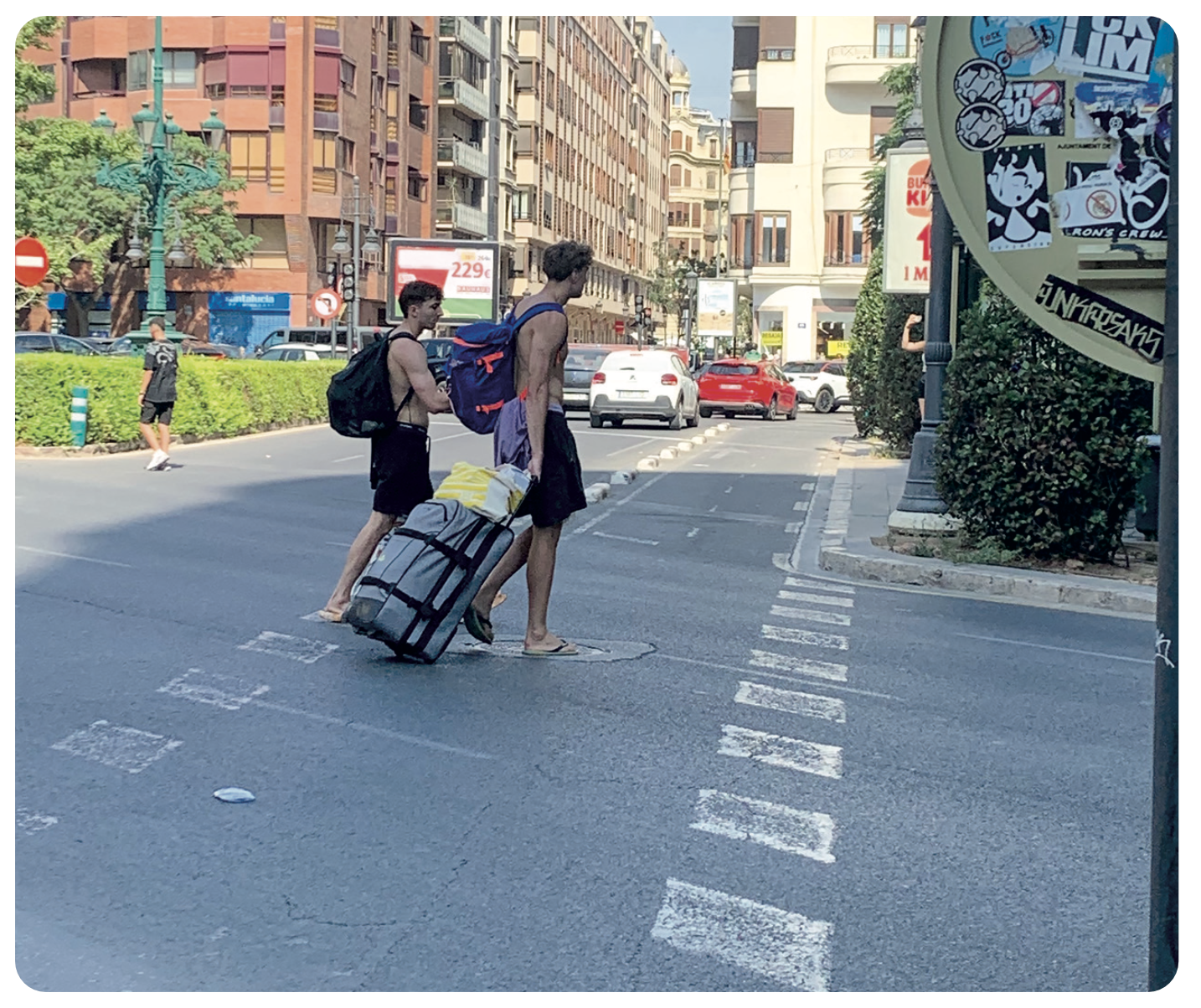Proyecto vecinal organizado por Amics de Velluters: La instalación se convierte en un espejo de la ciudad dividida, no por muros físicos, sino por percepciones. A un lado, la mirada del vecino: cotidiana, afectiva, crítica. Al otro, la mirada del turista: fascinada, fugaz, superficial. 30 paneles por lado que, vistos en conjunto, invitan a «girar la cabeza», literalmente, para ver la ciudad desde el otro lado. Ambos lados están diseñados para crear un efecto espejo emocional, pero narrado desde realidades contrastantes.